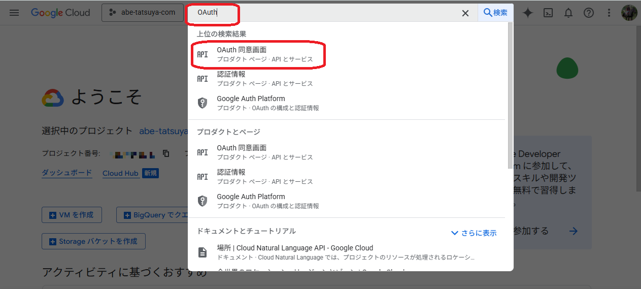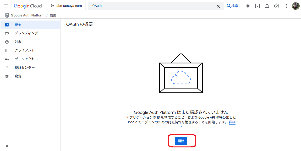 画面上部の検索バーで「OAuth 同意画面」を検索し、OAuth同意画面の設定に進みます。