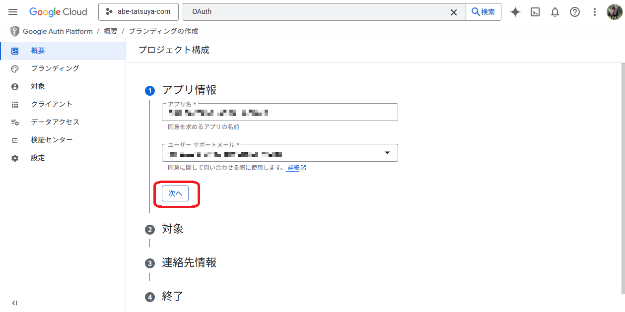 「アプリ情報」セクションで、任意のアプリ名と、サポートメールアドレスを入力します。「次へ」をクリック。