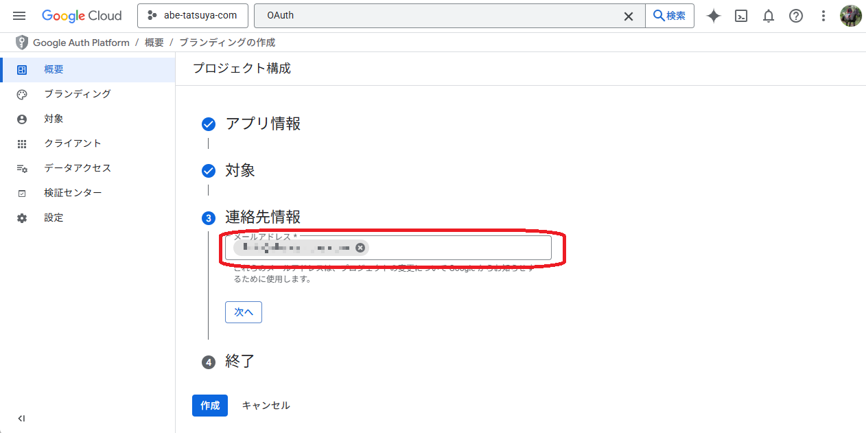 「作成」をクリックして、OAuth 同意画面の基本設定を完了します。