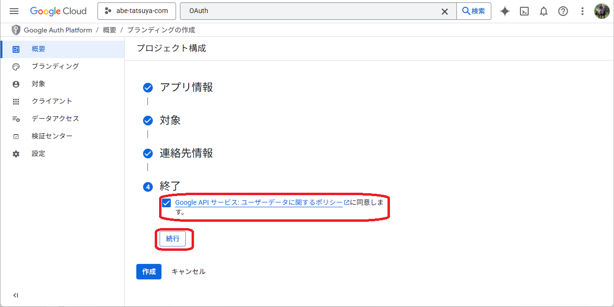 「終了」セクションで、Google API サービスのプライバシーポリシー同意チェックを入れ、「続行」をクリックします。