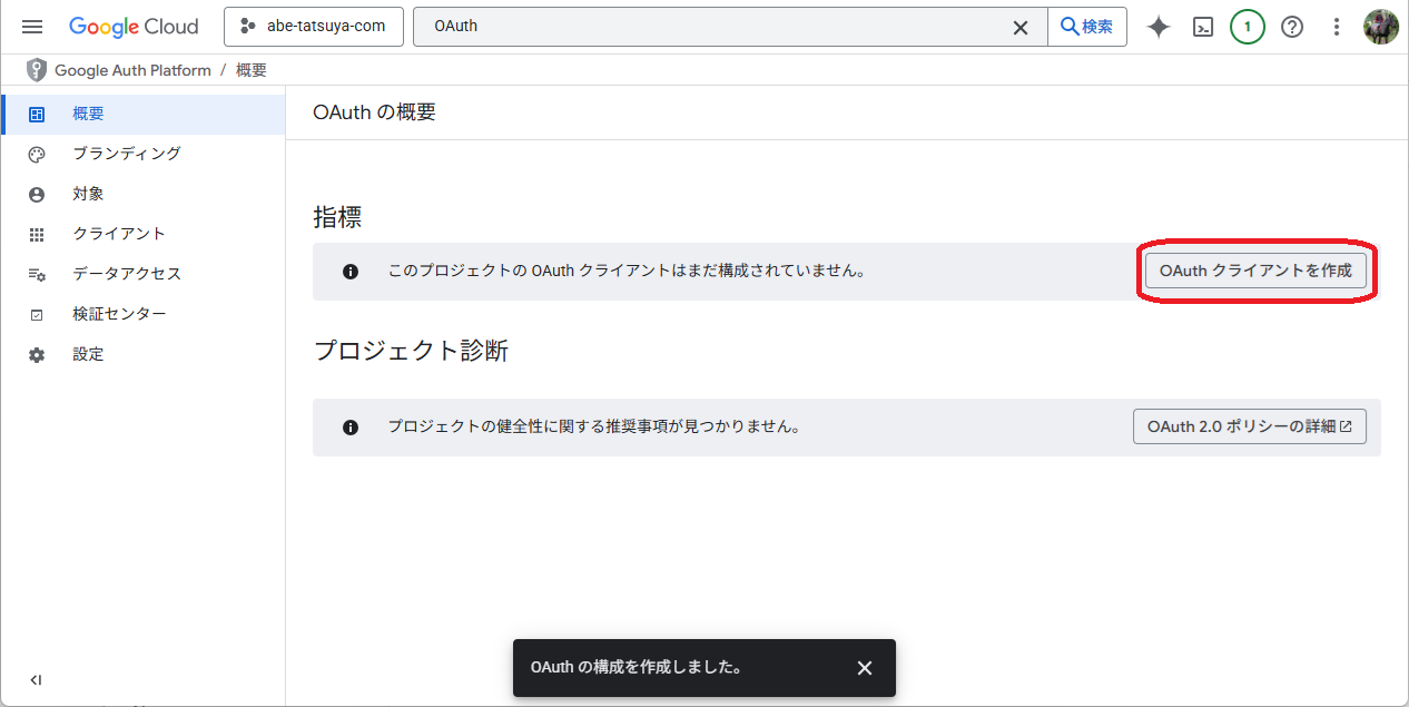 OAuth 同意画面の作成が完了したら「OAuth クライアントを作成」をクリックします。
