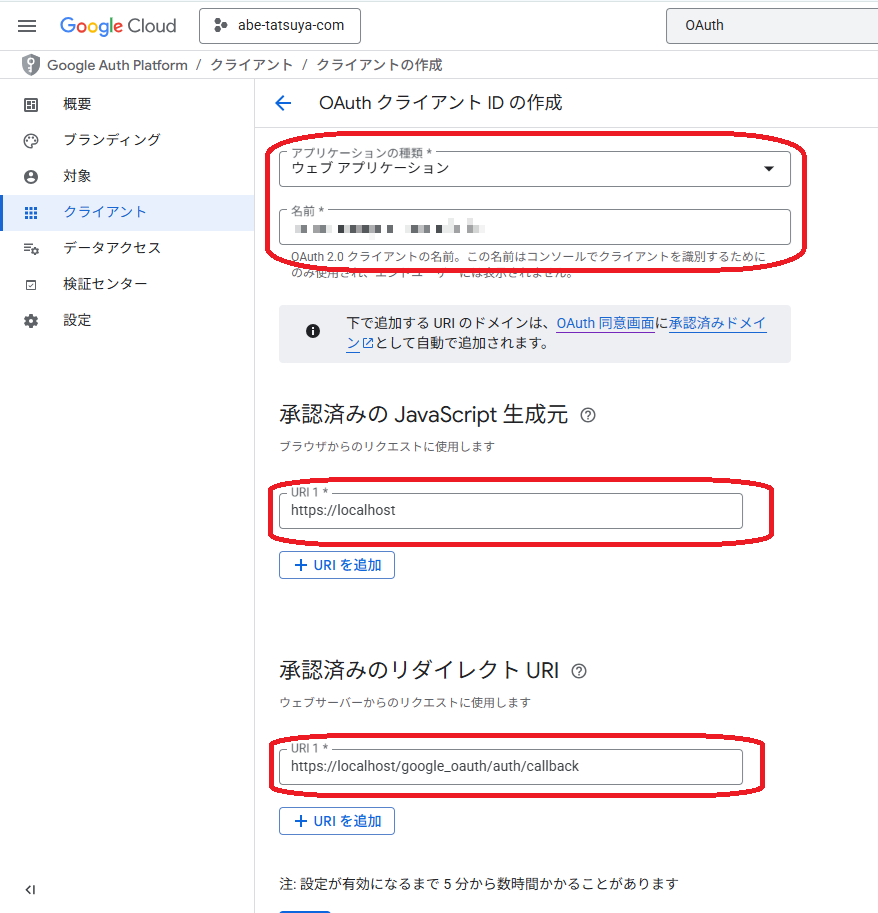 「承認済みの JavaScript 生成元」には、ローカル環境であれば https://localhost を追加します。