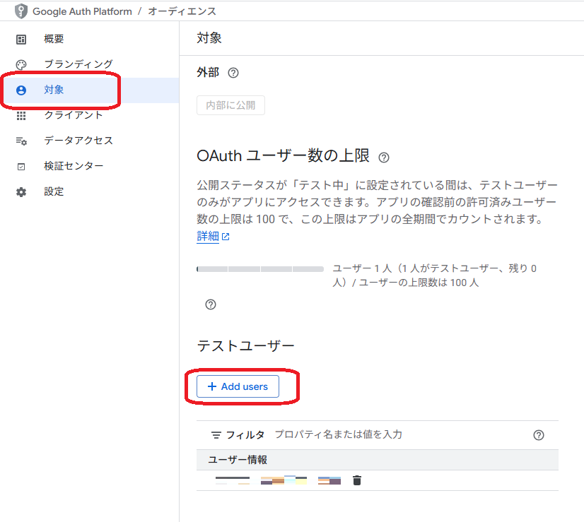 左のメニューから「対象」を選択し、「テストユーザー」セクションで「Add Users」をクリック。テスト用の自分のGoogle アカウントのメールアドレスを追加します。