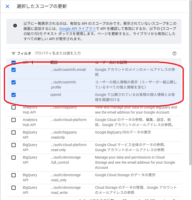 取得するデータのスコープを選択します。今回は、基本的なプロフィール情報とメールアドレスを取得するために、以下のスコープを選択します。