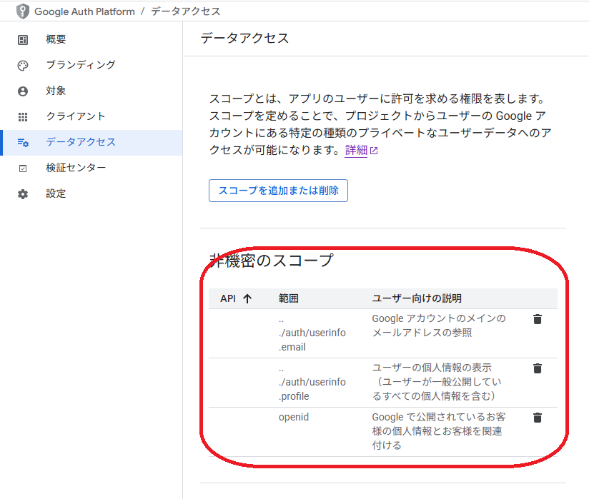 Google アカウントでのログイン時に取得するデータのスコープを設定します。